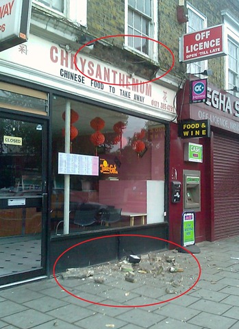 When out walking Milo this morning, I discovered a building that had started falling apart over night. In this photo, you can see how the concrete facade crumbled, along with the light that was attached to it. Yes, the entire thing just fell apart after only 80 or so years (I assume). I’m sure the owner wasn’t thinking of repairing it yesterday, because it was still in place; even if it was dilapidated. But today is probably the right time to do a little repair work.