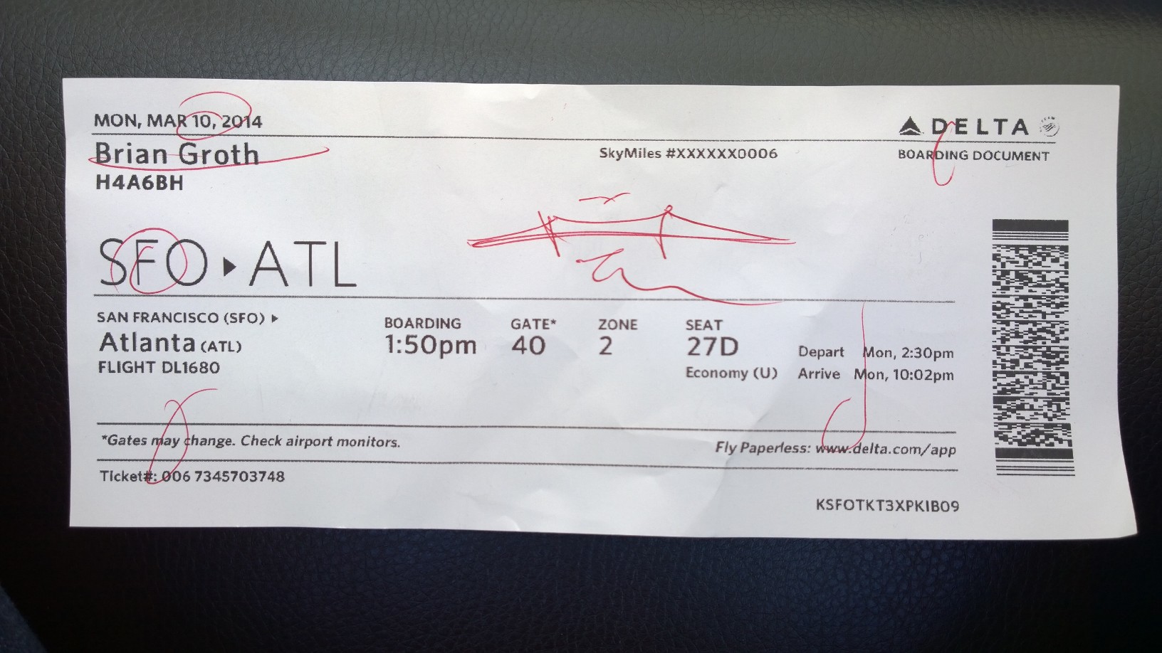 The TSA agent who checks your ID and flight info before you go through the scanners had a bit of extra time with me, since the lines were backed up. So, she decided to draw a picture of Golden Gate bridge for me.