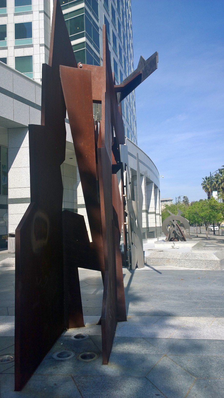 Two pieces of art in front of the Adobe building in San Jose.