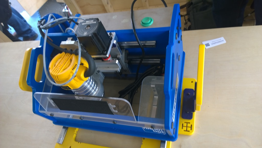 This is ShopBot, which is a computer-controlled router. They have a few different sizes and apparently the software can help you divide up a large piece of wood and once it finishes one section, you move it to the next for it to continue creating whatever you have designed.