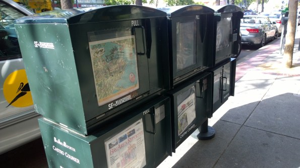 Newspaper boxes. Yes, even in the tech city in Silicon Valley, there are newspapers to be had. These are all over the city, but most of the papers are free.