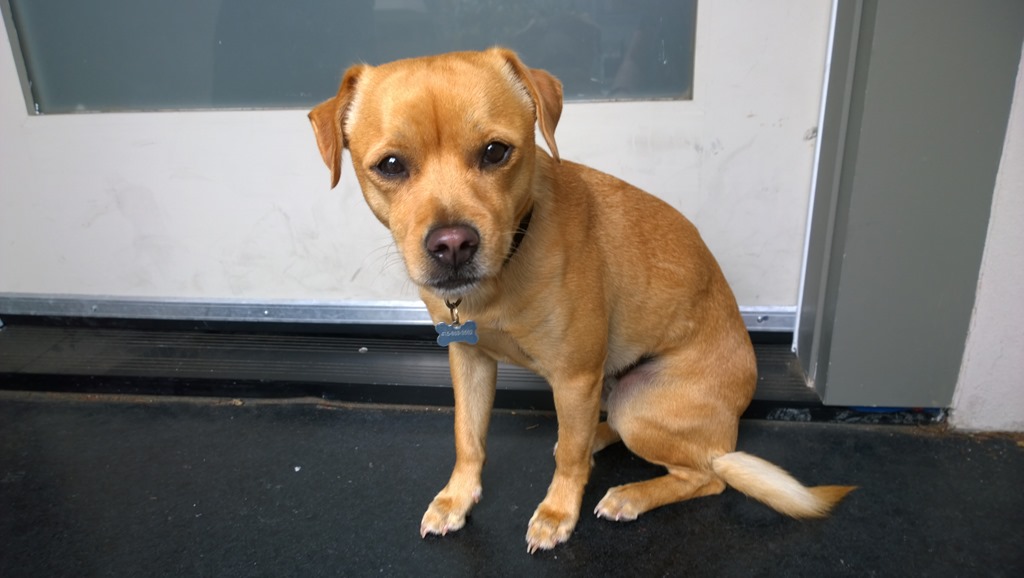While walking Busby this morning, we came across this little dog sitting on the corner of our street. He was all alone and looked a bit frightened. So, I had Busby sit as I coaxed him over to me, which didn’t take much, since he was almost begging to be helped. I picked him up and walked the half-block to our front steps. Thankfully, the tag on his collar said Junior and had a phone number.
