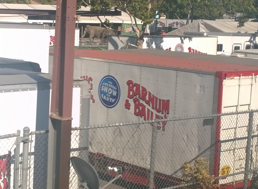 While my train pulled out of San Jose this afternoon, I could see a few unfortunate animals, such as the elephants in the background of the photo. Neat to see, but I feel bad for them.