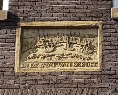 This translates to ” In the city of Bordee” although it is on a wall in Amsterdam. Apparently, it is referring to Bordeaux in France. See https://www.flickr.com/photos/vvag/2983938142
