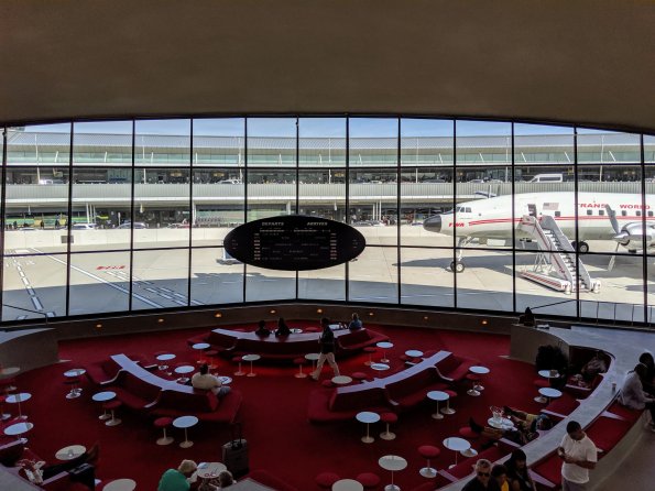 But our highlight was probably the old TWA terminal at JFK, which is now a hotel for layoversand a bit of a museum. The best is the rooftop pool & bar with a view of the runways. Yes, we sat in the pool with a G&T as we looked out at the runway watching planes take off and land. The big Airbus A380 is impressive to see. However, they have also converted their old Connie airplane into a lounge and the the entire place has an early 1960 theme to it.