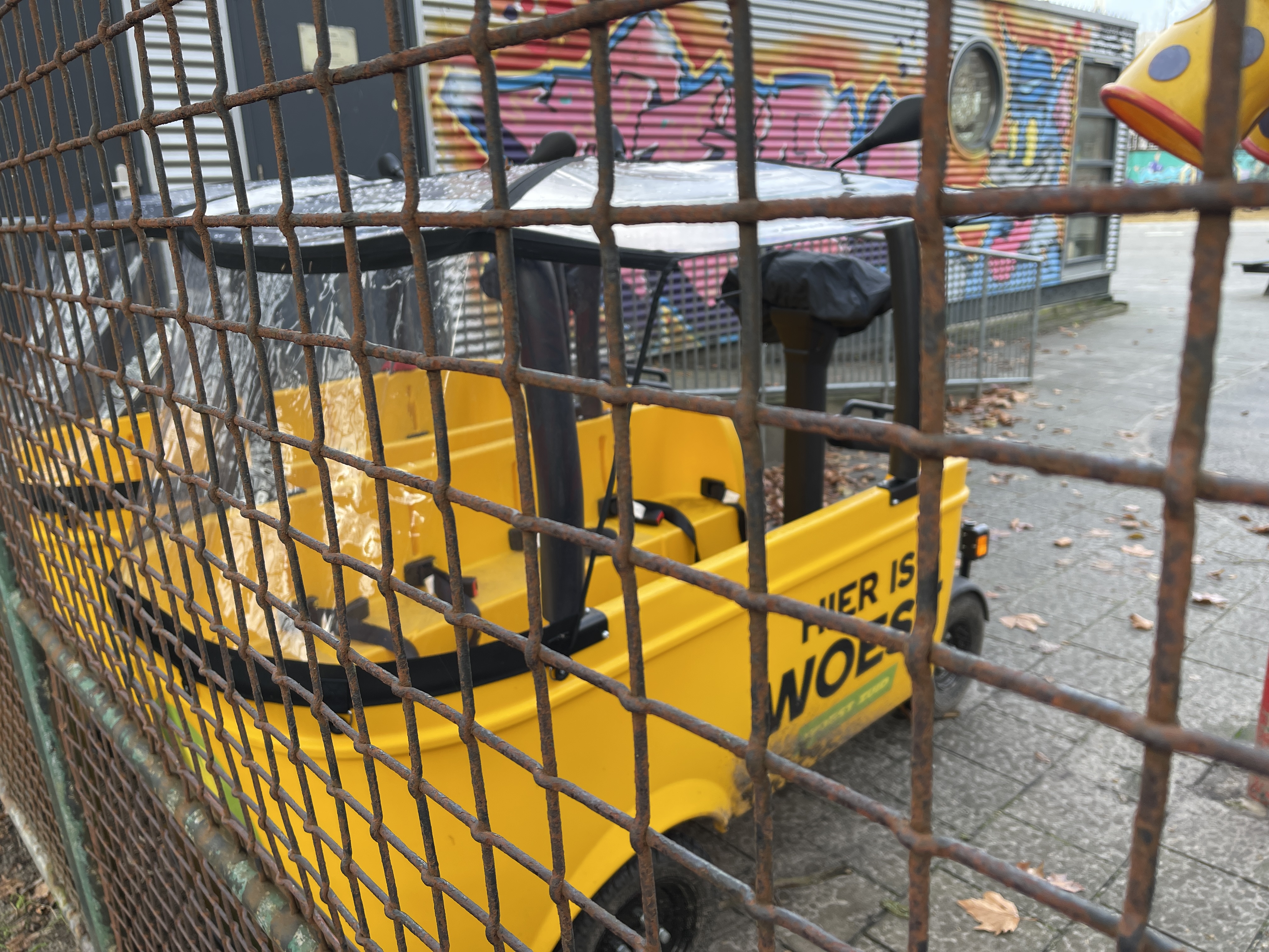 Look closely and you can see where the adult stands in the back, behind the handlebars and throttle, which are under a black cover right now. Up to eight kids sit sideways facing each other, all seat-belted in. These even have a cover on the top and front to keep some of the rain off of the kids. These drive on the bike lanes, and are about as wide as most bike lanes too.